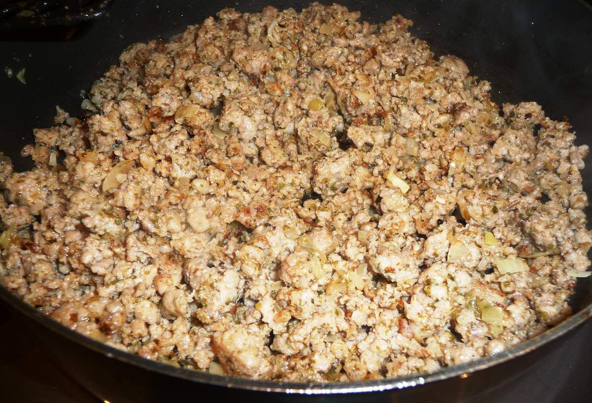 2) Hacher l'oignon. Dans une poêle à haut rebord ou une casserole, chauffer un filet d'huile d'olive. Ajouter la saucisse et l'oignon et faire revenir quelques minutes jusqu'à ce qu'il n'y ait plus d'eau et que la saucisse soit dorée. Casser un peu la saucisse avec une spatule. Démarrer la cuisson des pâtes
